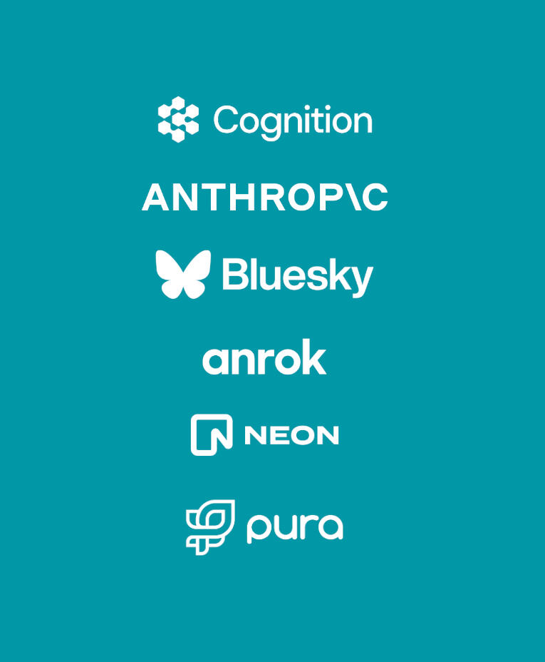 Cognition ($4B), Anthropic ($60B), Neon ($1B), Bluesky ($700M), Pura, Private AI, Granica, Anrok, Matey, Recraft, Forge, and more.I've most commonly co-invested with:
